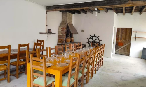 La Forge, adjoining the Gîte Rétro, is a reception room available for organizing a group meal, a party, or simply a moment of sharing. Fully equipped, it is designed for simplicity, joy, and fond memories.